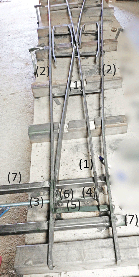 4 = Entaille dans le rail de voie + amincissement interne du rail pour la place réservée à l'aiguille. Amincissement interne de l'aiguille pour correspondre, sans heurt, au rail d'accès à l'aiguillage au passage de la roue.