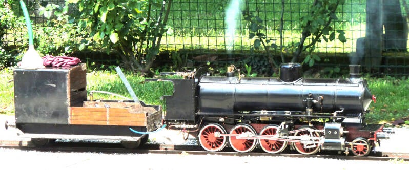 Locomotive à vapeur vive 1-4-0 : Le petit tuyau bleu draine l'eau vers la chaudière via une pompe manuelle. La soupape de sécurité laisse échapper la surpression de vapeur.