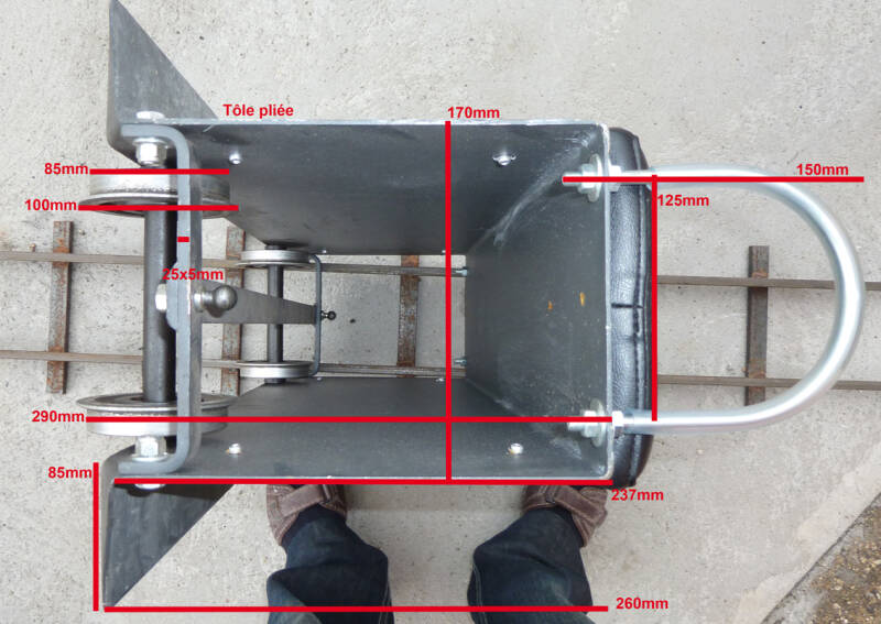 Coupe d'un wagon porteur en tôle pliée. A gauche les marchepieds. A droite les poignées de maintien. Les dimensions sont indiquées en mm.